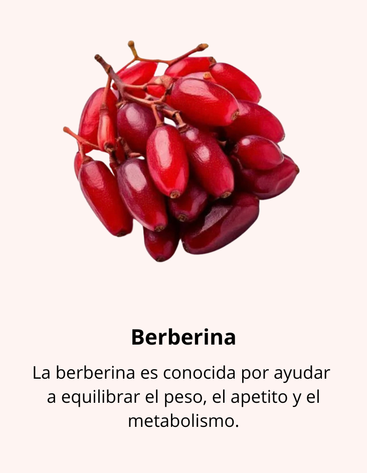 - Extracto de berberina, extracto de granada y extracto de canela: una sinergia natural que favorece la salud metabólica, ayudando a mantener estables los niveles de azúcar en sangre y reduciendo los antojos de dulces. La berberina ayuda a regular la glucosa, el extracto de granada ofrece un potente efecto antioxidante que protege las células, mientras que la canela mejora la sensibilidad a la insulina, favoreciendo un mejor equilibrio energético.