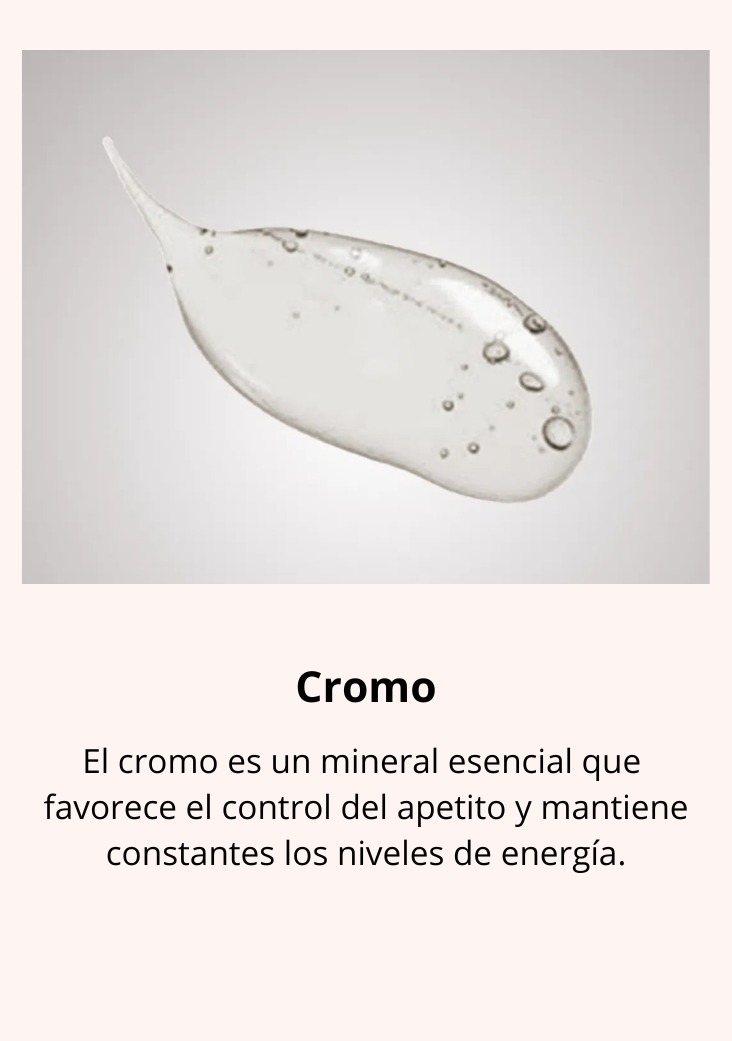 - L-Glutamina y Cromo: la L-Glutamina favorece la recuperación muscular y la conservación de la masa magra, lo que permite al cuerpo quemar grasas sin afectar a los músculos. El cromo, un mineral esencial, regula el metabolismo de la glucosa y ayuda a controlar el apetito, lo que facilita resistir los antojos y mantener unos niveles de energía constantes.